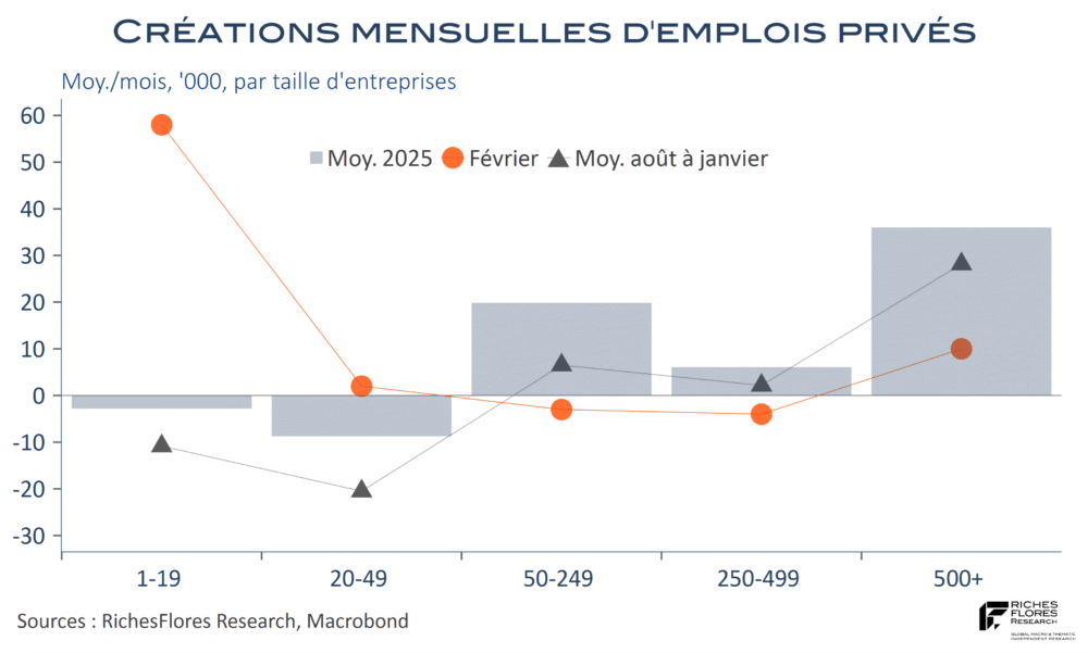 Les nouvelles en provenance des Etats-Unis sont de bon augure pour la conjoncture américaine. Les données de l’emploi privé de février sont incontestablement d’un meilleur cru que ces derniers mois, avec 63 K créations de postes, au lieu de 11 K en janvier, ce qui correspond à un rythme dix fois plus élevé que la moyenne des six derniers mois. La grosse masse de ces créations vient, en outre, des entreprises de très petite taille, moins de 20 salariés, jusqu’à présent grandes absentes du marché de l’emploi.