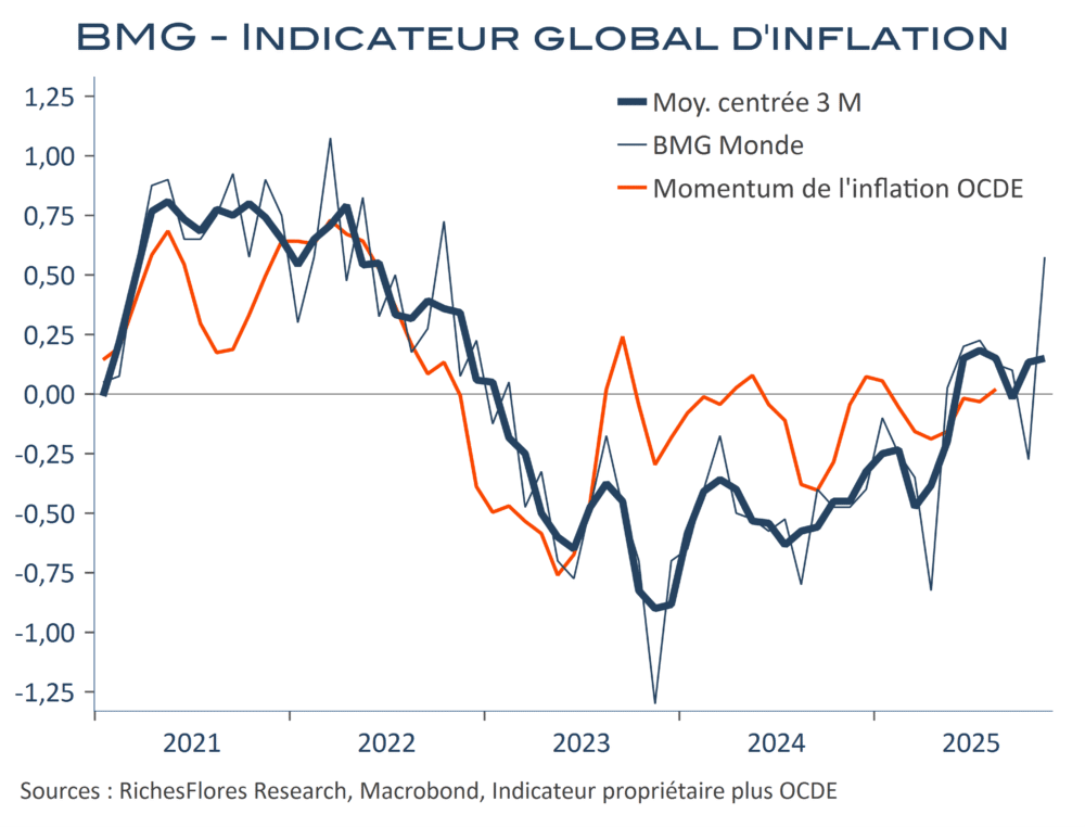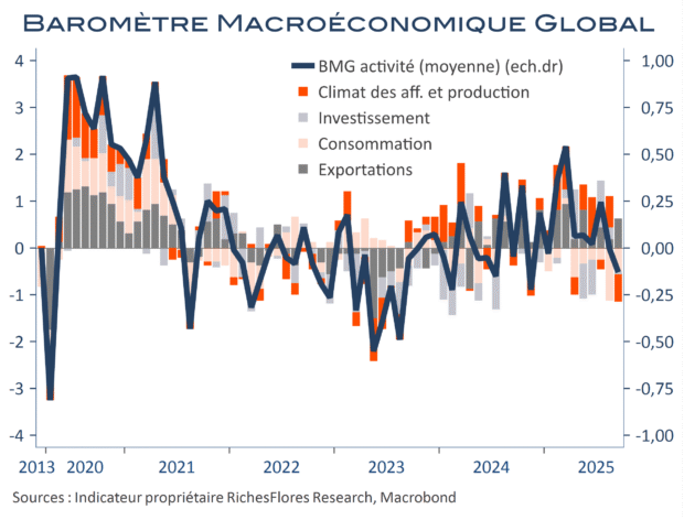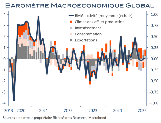Révisé en hausse de 0 à 0,3 en novembre, notre baromètre macroéconomique global retombe à -0,2 en décembre du fait d’ajustements à la baisse marqués dans la plupart des pays, exception faite du Japon. Les données américaines, qui ne couvrent que partiellement les deux mois passés, accusent une sensible détérioration, tant du côté de la production que sur celui de la consommation. En Chine, où la dégradation est également marquée, notre indicateur synthétique tombe à -0,8, son plus bas niveau depuis juillet 2023. Enfin zone euro et Royaume-Uni retombent en territoire négatif encore du terrain. Notre indicateur global d’inflation remonte sensiblement ce mois-ci, à 0,6, un plus haut depuis octobre 2022.